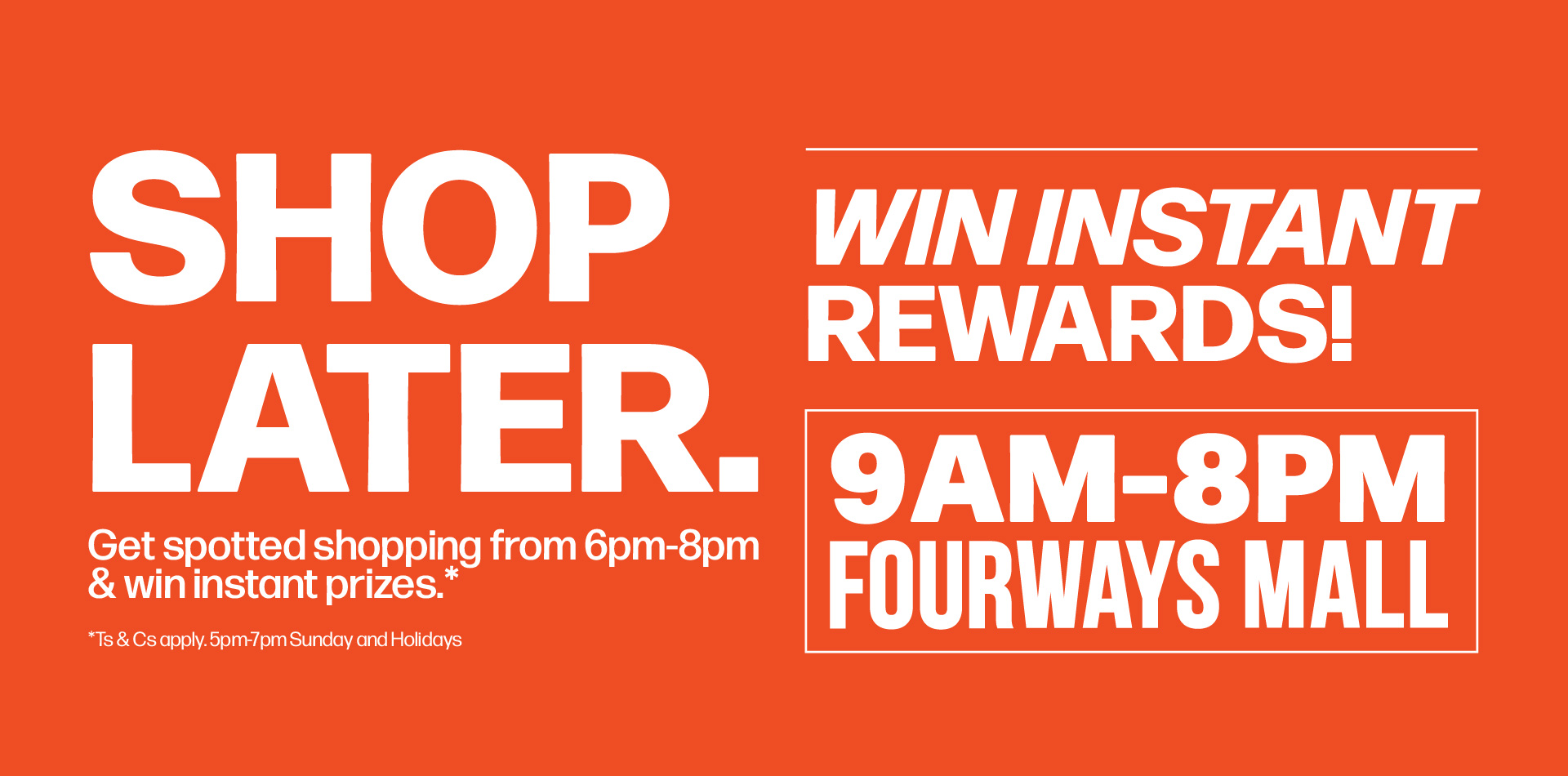 Shopping hours Mon-SAT: 09:00 - 20:00 Sun and Public Holidays: 09:00 - 19:00 |